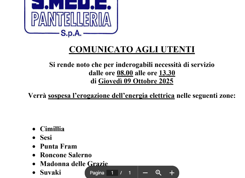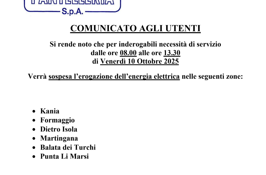 Nelle mattinate del 9 e 10 ottobre prossimi, la società SMEDE procederà all’interruzione di energia elettrica in diverse contrade e strade dell’isola.