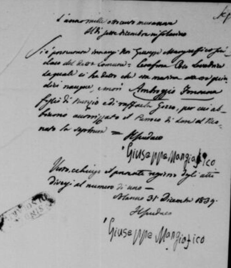 • 1839 – Serafina Coco, presente alla nascita e morte di Ambroggio Fontana.