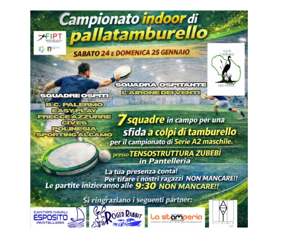 Sabato 24 e domenica 25, presso la Tensostruttura di Zubebi, in Pantelleria, si terrà il Campionato indoor di Pallatamburello di Serie A2 maschile.