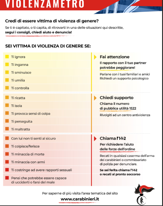 Anche quest’anno, tante caserme dell’Arma si illumineranno di arancione, in adesione alla campagna internazionale “Orange the World”, come segno concreto dell’importante impegno profuso dall’Istituzione. Inoltre, sul sito www.carabinieri.it, è stata dedicata un’intera sezione al “Codice Rosso”, che offre informazioni sul fenomeno e sugli strumenti di tutela delle vittime, mettendo a disposizione un test di autovalutazione, denominato “Violenzametro”, che rileva il livello di violenza subita in un rapporto di coppia ( http://www.carabinieri.it/in-vostro-aiuto/consigli/codice-rosso/codice-rosso ).