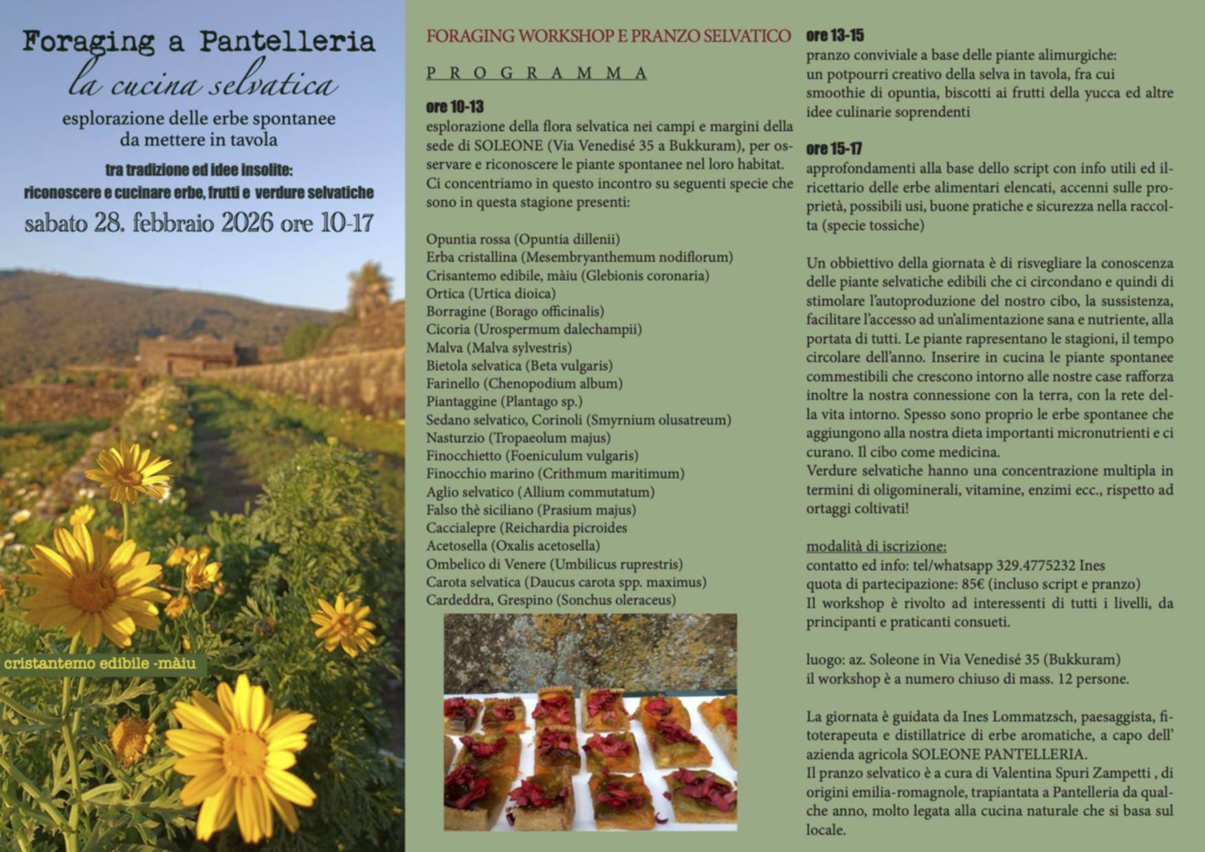 6L’evento è organizzato dall’azienda agricola “Soleone Pantelleria” che ospiterà il workshop. Uno dei principali obbiettivi della giornata è di stimolare la conoscenza delle piante selvatiche commestibili che ci circondano ed arricchire l’autoproduzione del nostro cibo con risorse disponibili a tutti, facilitando l’accesso ad un’alimentazione sana, nutriente e completa.