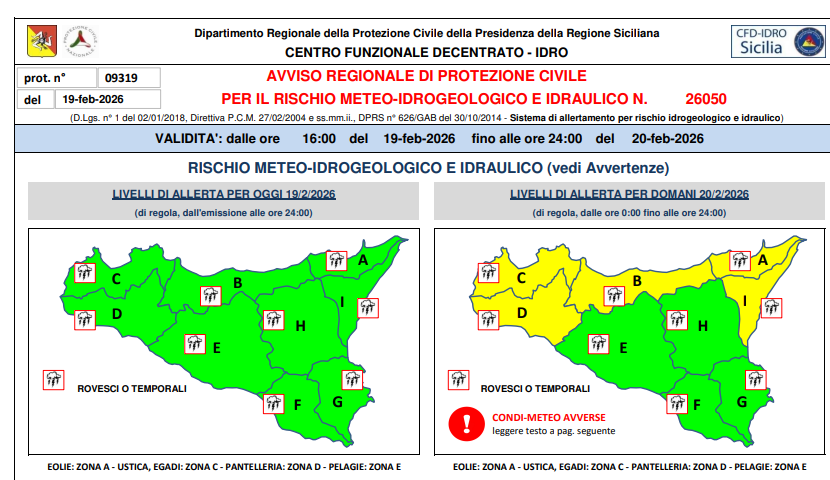 La Protezione Civile della Regione Siciliana ha emesso un nuovo bollettino di allerta meteo per domani 20 febbraio 2026, caratterizzata da