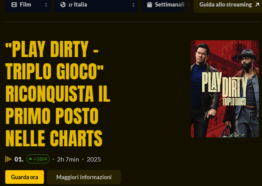 l’ultima classifica inerente a top film e serie TV più gettonate in Italia nell’ultima settimana: https://www.justwatch.com/it/streaming-charts I FILM Per i film, questa settimana entra direttamente in vetta Play Dirty –...