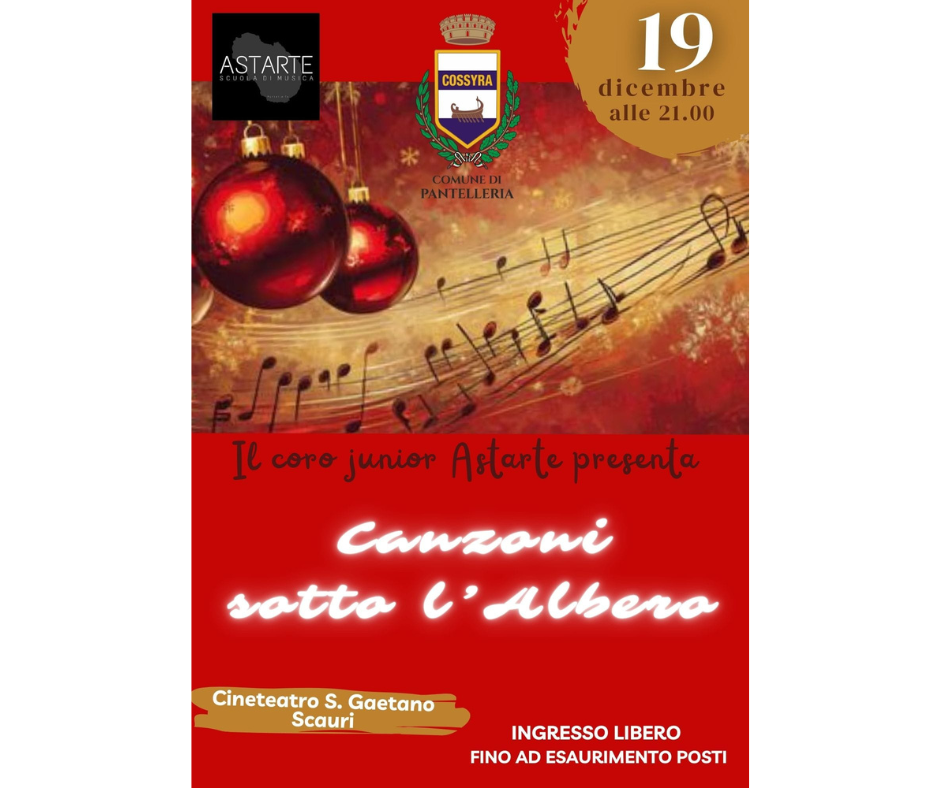 Venerdì 19 dicembre, dalle ore 21.00, presso il Cineteatro San Gaetano di Scauri, in Pantelleria, si terrà il concerto “Canzoni sotto l’Albero“, con il Coro Junior Astarte.