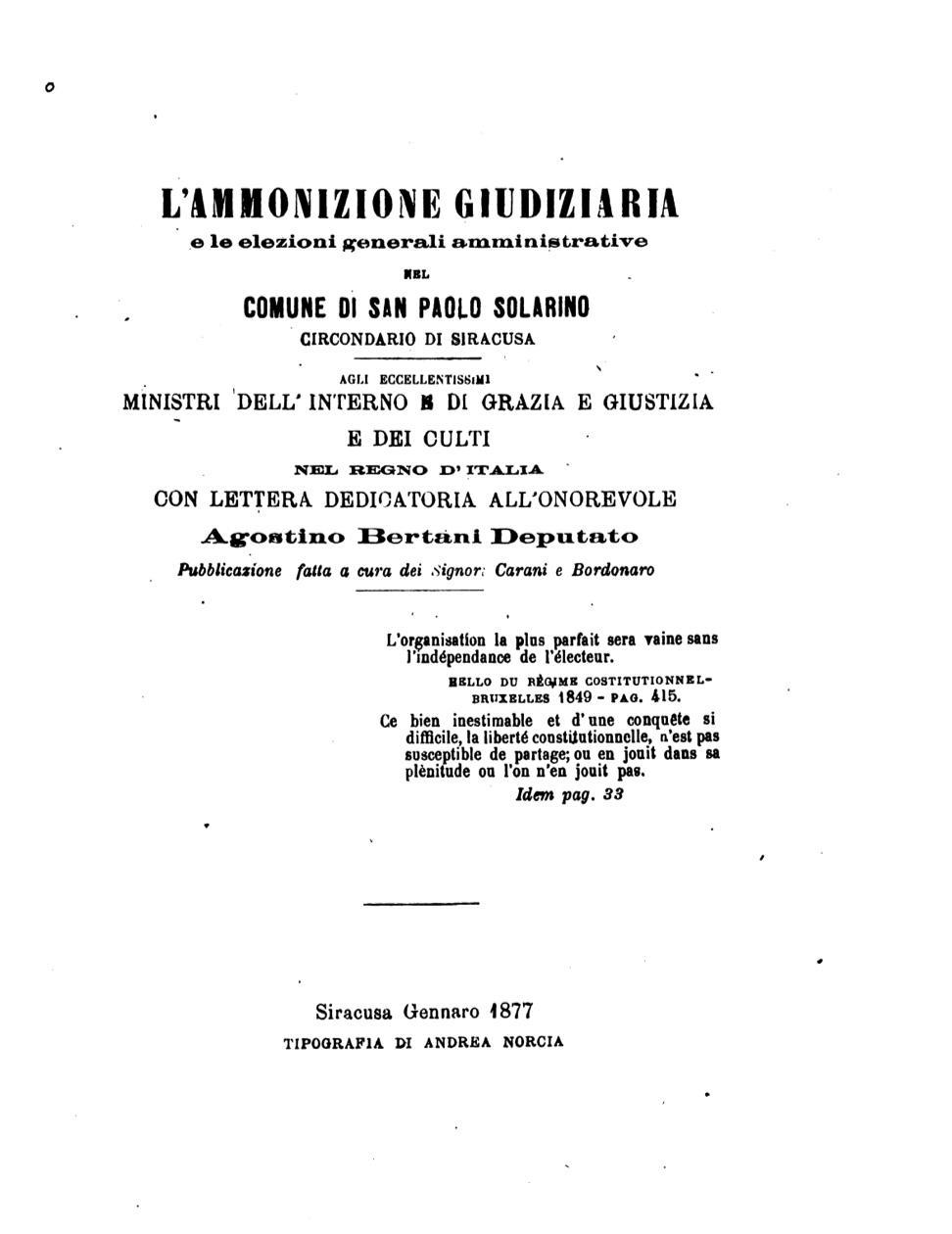 Bertani, con la sua prefazione in difesa , richiamò l’attenzione del governo sull’arbitrarietà dell’atto, sottolineando il principio fondamentale dell’indipendenza della magistratura: la legge non può piegarsi alle pressioni politiche, nemmeno in un piccolo comune come Solarino.