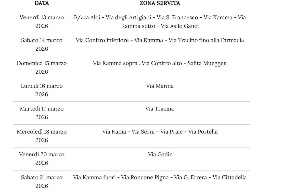 L’erogazione dell’acqua nelle contrade di Kamma e Tracino riprenderà secondo il seguente calendario