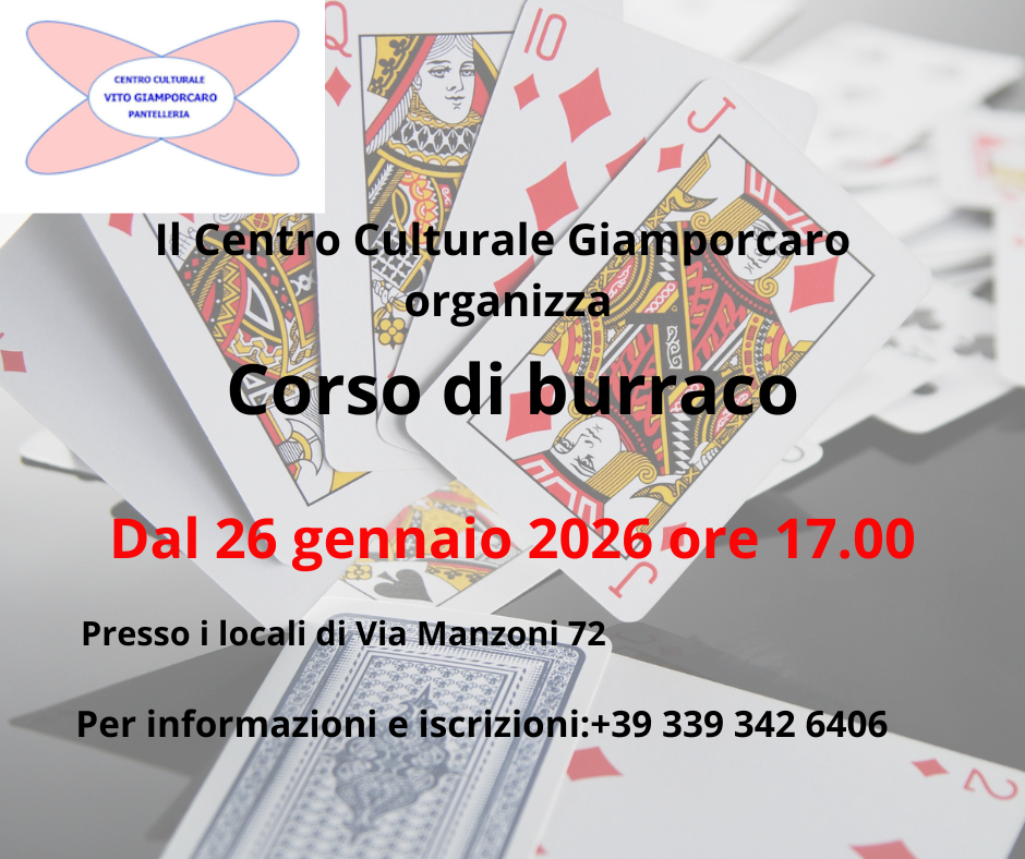 Il Centro Culturale Vito Giamporcaro dal giorno lunedì 26 gennaio, dalle ore 17.00, organizza un corso di burraco, per principianti.