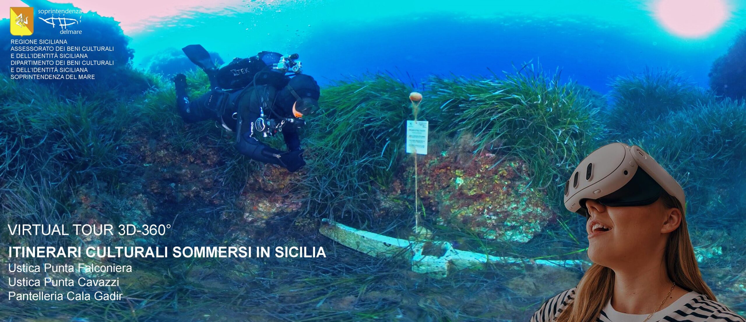 Lo spazio espositivo del Dipartimento dei Beni culturali e dell’Identità siciliana della Regione Siciliana, ha ospitato le postazioni della Soprintendenza del Mare dove è stato possibile immergersi virtualmente sugli itinerari archeologici subacquei siciliani. Grazie alla tecnica di ripresa di video a 360° in 3D, i visitatori hanno effettuato un’esperienza multisensoriale con i visori oculus Meta Quest; una vera e propria immersione subacquea con una voce narrante, ologrammi per illustrare i reperti sul fondale e i suoni del mare.