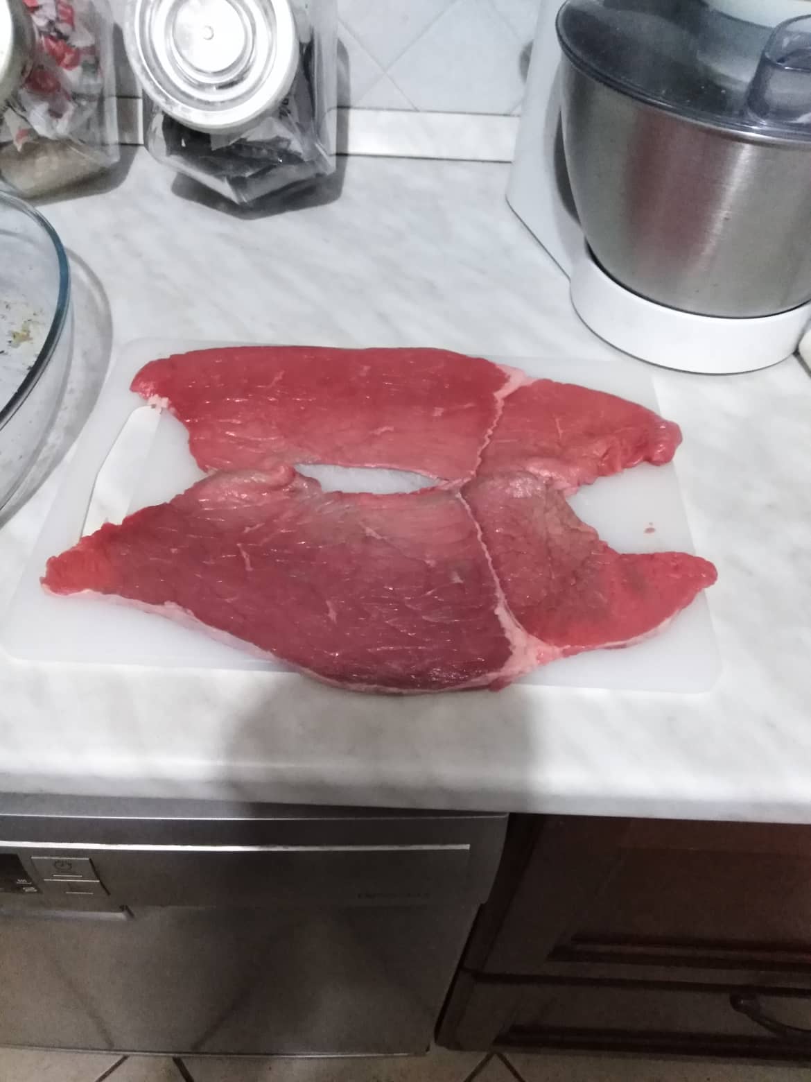 Procedimento: Impastare la carne trita con mollica di pane, prezzemolo, sale, pepe, parmigiano e uova Mettere sulle fettine l”impasto.
