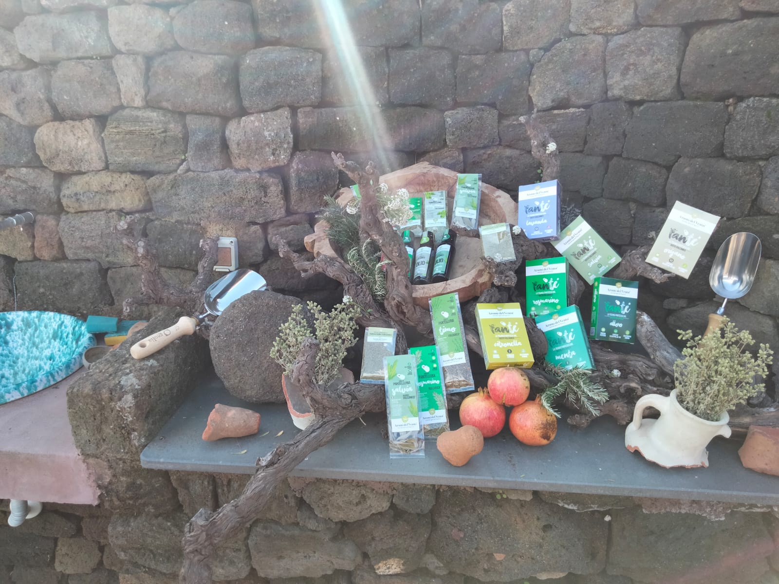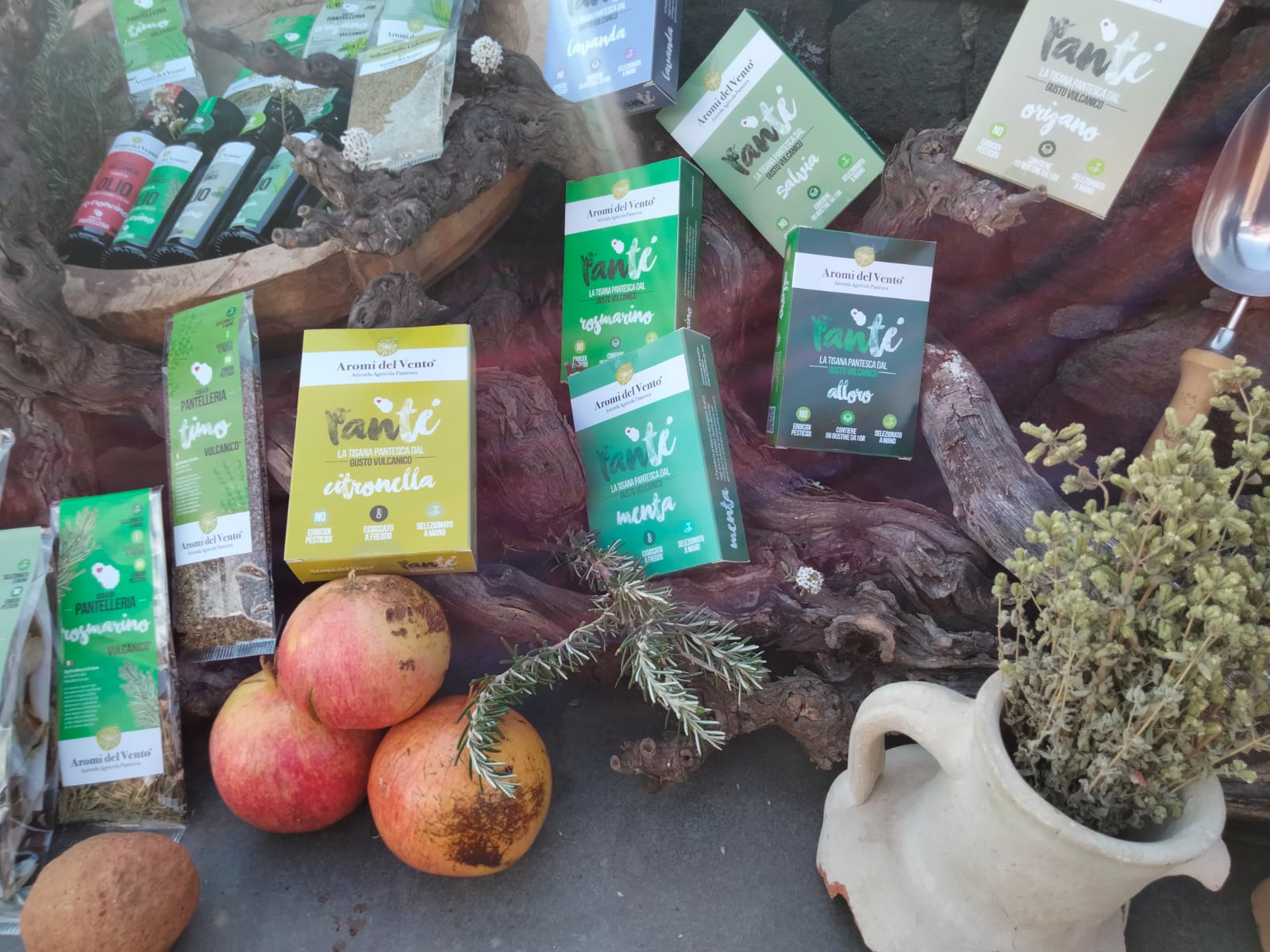 Ma questa coltura era o è ancora per uso proprio, famigliare? “Fino ad una decina di anni fa, si. Ora qualcuno comincia a dedicarsi ad essa, potendo trasformare come coltura da reddito. Riteniamo che sia anche giusto non fossilizzare la produzione dell’azienda ad un solo prodotto. Noi per esempio produciamo anche erbe aromatiche e siamo l’unica realtà agricola sull’isola a farlo. Le altre aziende come erbe aromatiche producono solo origano, noi invece, come le mostrerà mio figlio, coltiviamo anche lavanda, rosmarino, salvia, timo e tanto altro ancora, la citronella, l’alloro. Antonio ha voluto fortemente questa innovazione e ci siamo lanciati con Aromi del Vento. Noi abbiamo creato una filiera con le aromatiche, presso il nostro laboratorio: coltiviamo le piante, raccogliamo il prodotto, lo lavoriamo (essicchiamo), lo imbustiamo ed etichettiamo, per poi venderli nei negozi locali. Ma tutto comincia in campo.