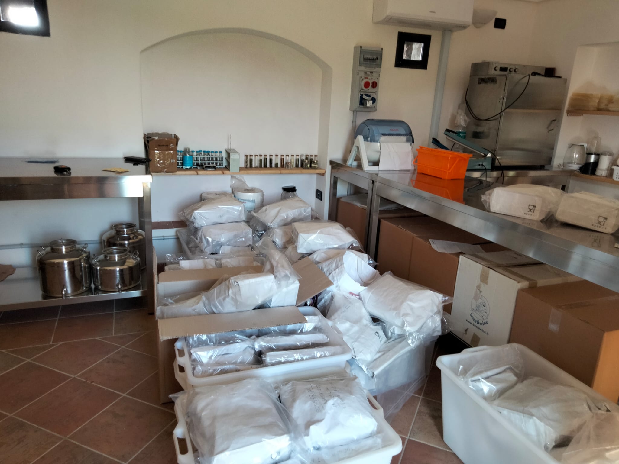 Dalla stupenda tenuta di San Vito, con Antonio D’Ancona, ci siamo spostati a quella di Ziton, dove troviamo il laboratorio e l’impianto di essiccazione delle piante aromatiche, che conduce a chiusura la filiera dei prodotti Aromi del Vento.