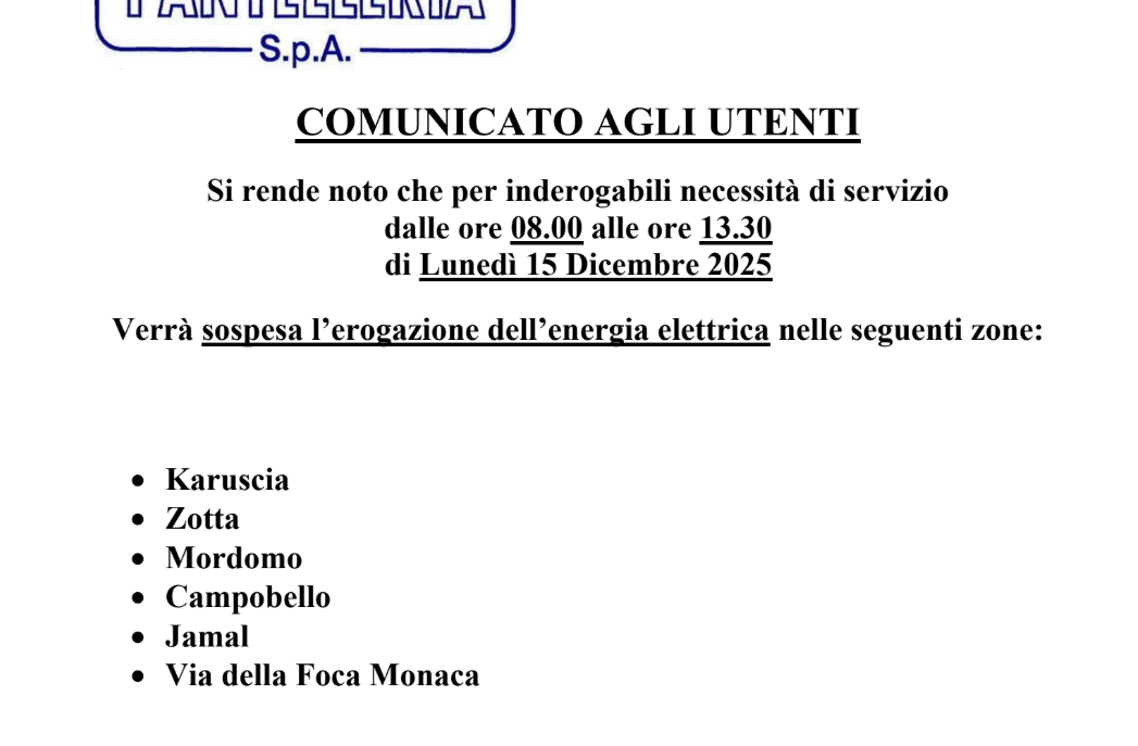 Pantelleria, distacco energia elettrica per il 15 dicembre