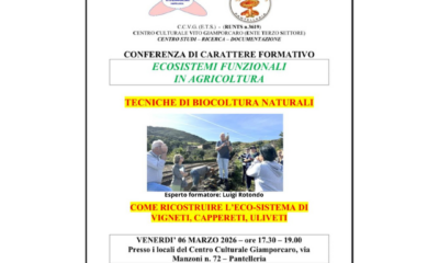 Venerdì 6 marzo, dalle ore 17.30, presso i locali del Centro Culturale Vito Giamporcaro di Via Manzoni 72 – Pantelleria, si terrà la conferenza di carattere formativo: “Ecosistemi funzionali in agricoltura – Tecniche di biocolutra naturali”.