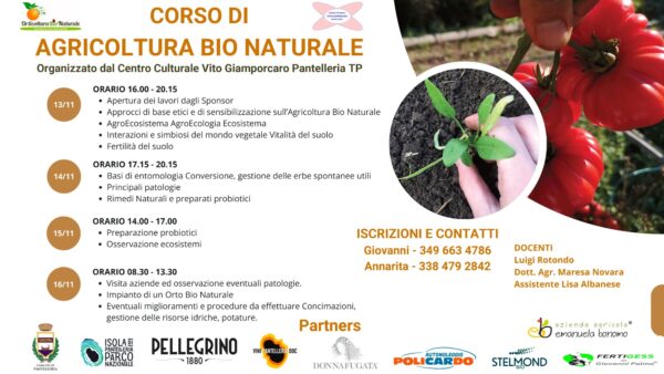 Abbiamo notato che questo corso è considerato talmente valido, che il centro Giamporcaro ha radunato parecchi sostenitori: oltre Comune e Parco Nazionale, il Consorzio Vini Doc, le cantine Pellegrino, Emanuela Bonomo e Donnafugata. Poi Fertigess e Stelmond Bio, ma anche l’Autonoleggio Policardo, seppur non sia del settore. “Infatti, già durante una riunione dello scorso marzo abbiamo invitato diverse aziende, le più importanti hanno risposto, quindi Donna Fugata, Pellegrino, adesso è arrivata anche Emanuela Bonomo. Abbiamo anche come sponsor il Noleggio Policardo che è sempre molto sensibile ad appoggiare iniziative per il territorio. Tutta questa gente ha creduto in questo progetto presentato dal Giamporcaro, con il suo presidente Anna Rita Gabriele. Il Giamporcaro dura da 30 anni con un grande lavoro alle spalle: è uno dei maggiori soggetti attivi dal punto di vista sociale, culturale, il tutto, essendo una associazione no profit lo fa gratuitamente per la comunità di Pantelleria.”