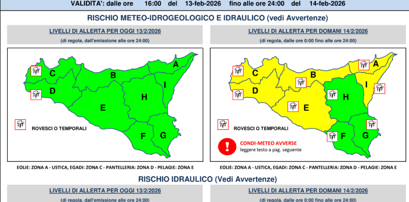 . Si invia, in allegato, l’avviso Regionale di Protezione Civile n. 26044 emesso in data 13 febbraio 2026 dal Dipartimento Regionale della Protezione Civile della Presidenza della Regione Siciliana – Centro Funzionale Decentrato – IDRO con validità dalle ore 16.00 del 13 febbraio alle ore 23.59 del 14 febbraio.