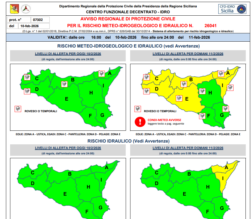 La Protezione Civile Regionale ha diramato un avviso di allerta gialla per la giornata di domani, mercoledì 11 febbraio.