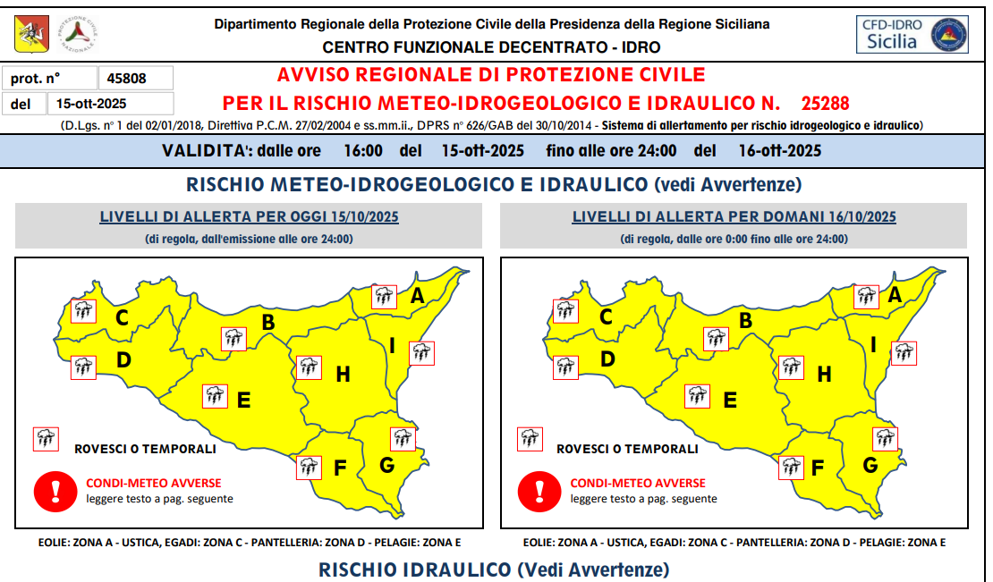 Dalle prime ore di domani, sabato 27 settembre 2025, e fino a termine giornata, si prevedono precipitazioni intense ed abbondanti a prevalente carattere di rovescio o temporale sulla Sicilia, con particolare riferimento al settore meridionale dell’isola, I temporali saranno accompagnati da frequente attività elettrica, locali grandinate e forti raffiche di vento.