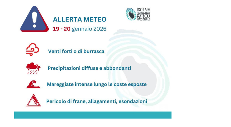 L’Ente Parco Nazionale Isola di Pantelleria informa cittadinanza e visitatori che, a seguito allertamento per condizioni meteo avverse preventivo diramato dalla Protezione Civile della Regione Siciliana, nei giorni di lunedì 19 e martedì 20 gennaio la fruizione della rete sentieristica del Parco è fortemente sconsigliata.