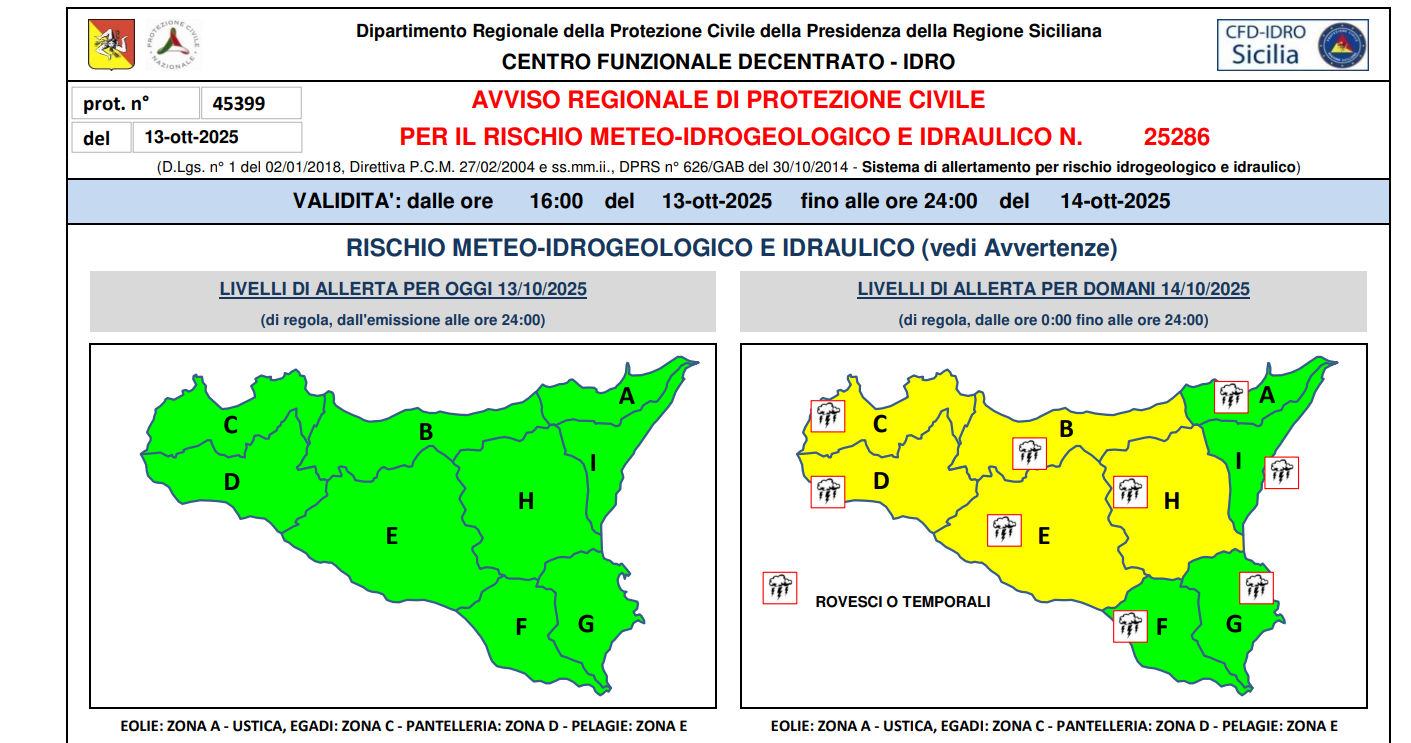 Le previsioni della Protezione Civile – Dipartimento Regione Siciliana