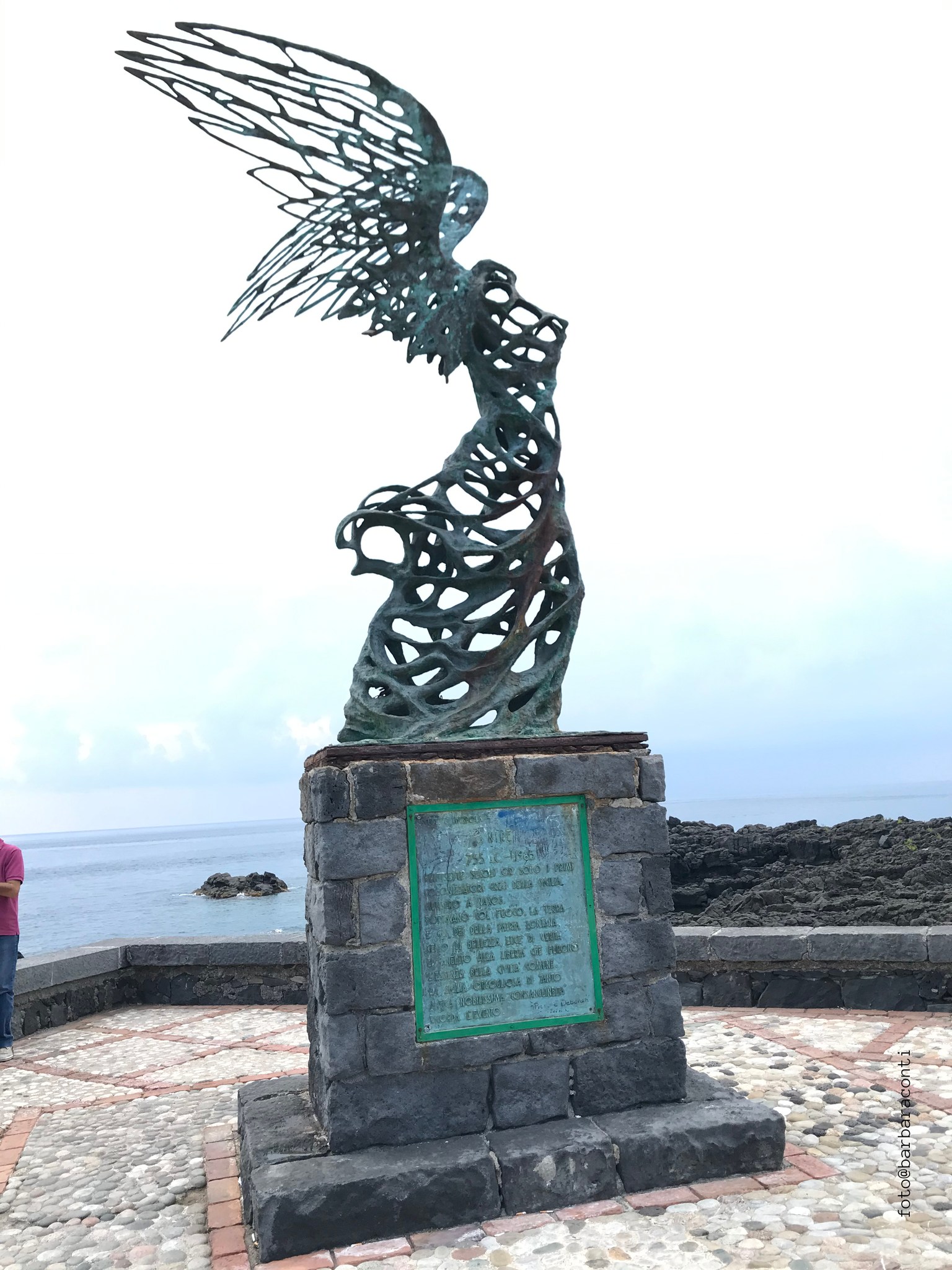 Realizzata nel 1966 in occasione del gemellaggio con Kalkis, la Nike è ormai parte integrante dell’identità visiva e culturale di Giardini Naxos. Le sue ali tese contro il vento sembrano quasi dialogare con la natura che la circonda, trasformando ogni burrasca in un nuovo capitolo della sua storia.