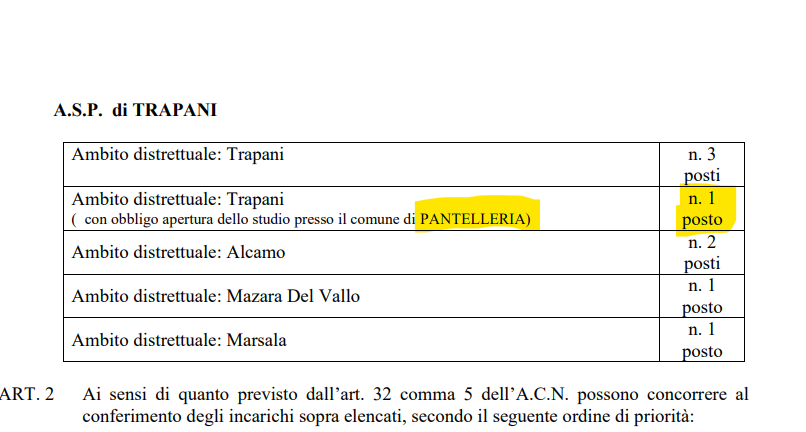 È stato pubblicato il bando per le zone carenti della pediatria di libera scelta, che include anche la sede di Pantelleria. Tuttavia, finché questa sede non verrà formalmente riconosciuta come zona disagiatissima, con il conseguente diritto a misure di incentivo economico e professionale, sarà altamente improbabile che il posto venga coperto.