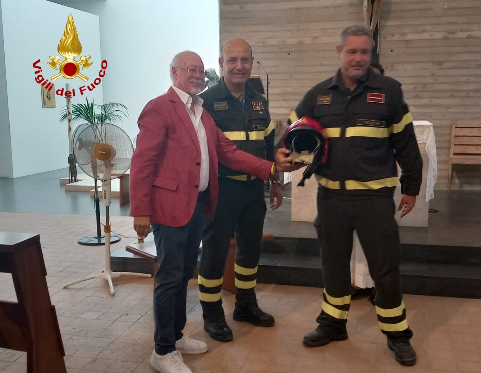Il Comandante Antonino Galfo, davanti ai fedeli e ai familiari dei vigili del fuoco, ha attaccato sul giubbino dell’uniforme di servizio il nuovo distintivo di qualifica.