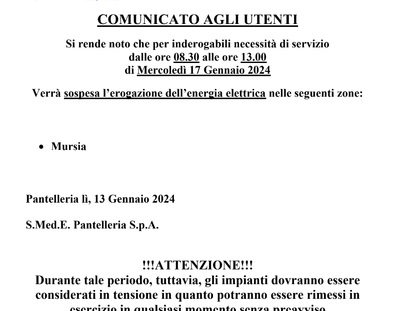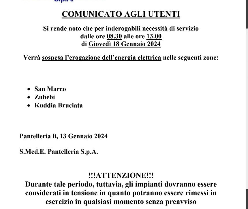 Pantelleria, distacco energia elettrica per 17 e 18 gennaio. Ecco dove