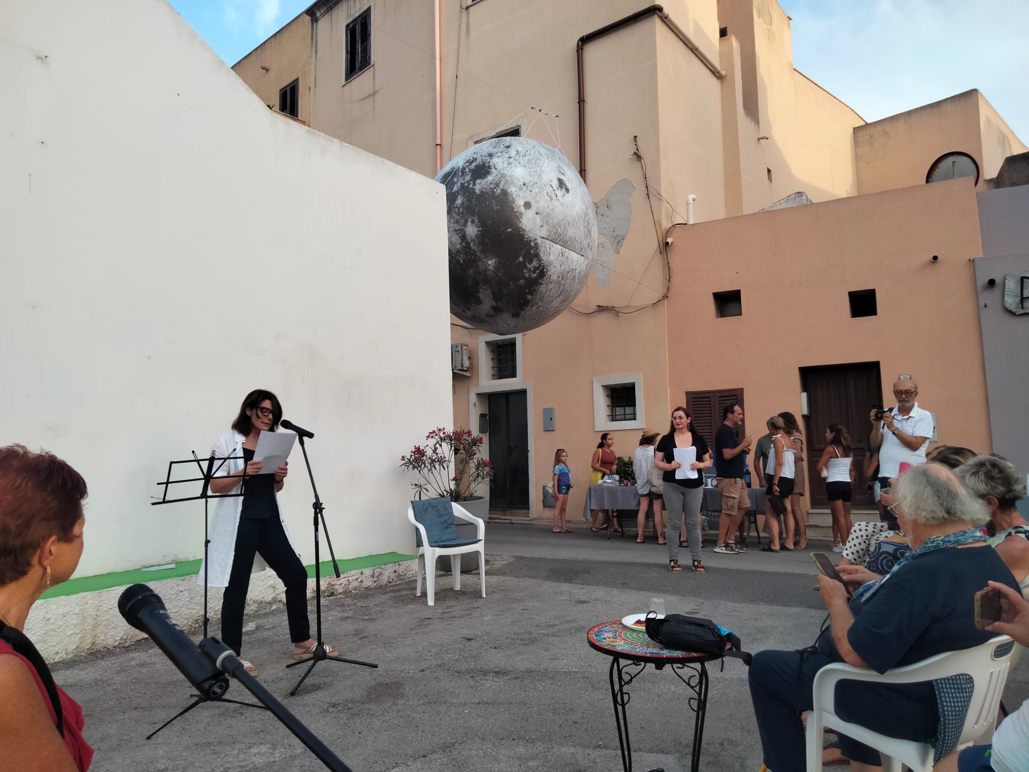 Sarà stata la suggestione di quella location, i residenti e negozianti seduti davanti i propri portoni, il mare del porto immobile. il vento caldo che conferiva alla pelle una sensibilità diversa, saranno state le letture curate da Cristina Barbagallo, le nenie di Nuccia Farina, l’enorme luna del compianto Filippo Panseca, ma ieri c’era un’atmosfera singolare, riverente, anzi ossequiosa verso l’astro d’argento.