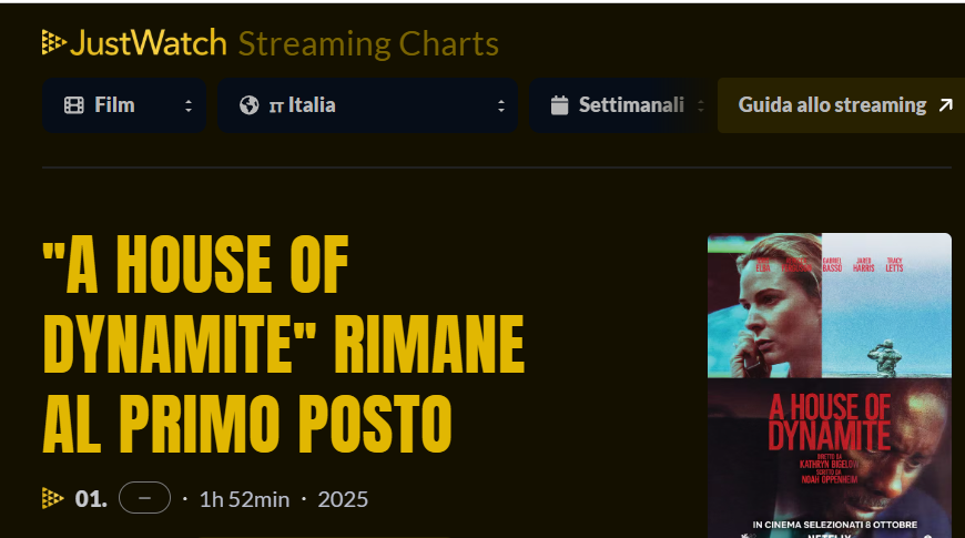 Per i film, A House of Dynamite stabile in vetta per la seconda settimana consecutiva. Presentato al Festival di Venezia, il film racconta la corsa contro il tempo scatenata quando un missile non rivendicato colpisce gli Stati Uniti: la missione è scoprire chi lo abbia lanciato e come reagire. Con A House of Dynamite, Kathryn Bigelow ha conquistato la critica firmando un thriller geopolitico carico di tensione, mettendo a confronto scienza militare, diplomazia e il rischio di un conflitto globale.