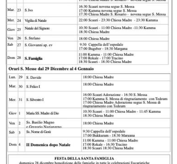 Di seguit riportiamo il calendario completo delle messe che si celebreranno nel Capoluogo e nelle contrade maggiori di Pantelleria