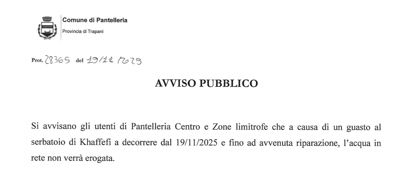 Da oggi 19 novembre, l’erogazione di acqua in Pantelleria centro e zone limitrofe è interrotta.