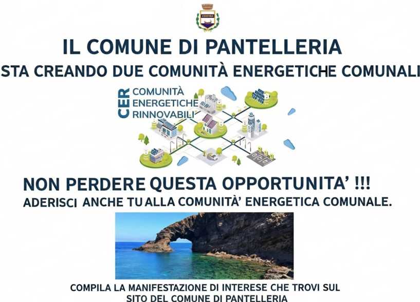 Il Comune di Pantelleria sta avviando un procedimento per l’acquisizione di candidature di soggetti (AGGREGATORI) per la costituzione di nuovi soggetti giuridici (CER) cui parteciperà anche l’Ente nelle forme consentite e ritenute idonee dalla normativa e dalla emergente disciplina regolamentare dell’Authority di Mercato (ARERA).