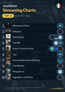 Per le serie TV, entra direttamente in vetta Welcome to Derry, la nuova serie ambientata negli anni ’60 nella cittadina del Maine. Lo show esplora le origini di Pennywise, il clown più spaventoso di sempre, e il male che infestava Derry molto prima degli eventi narrati nei film e nei romanzi.