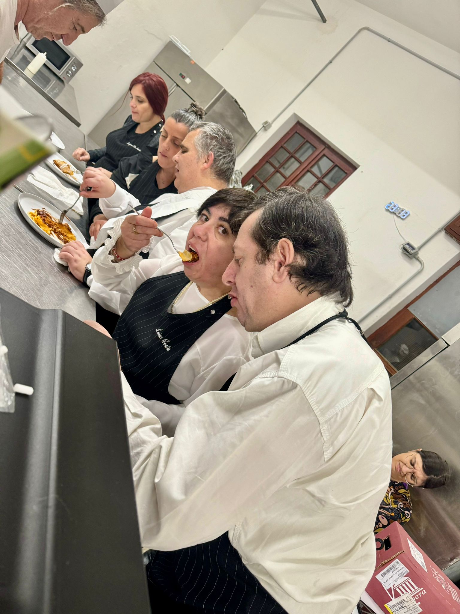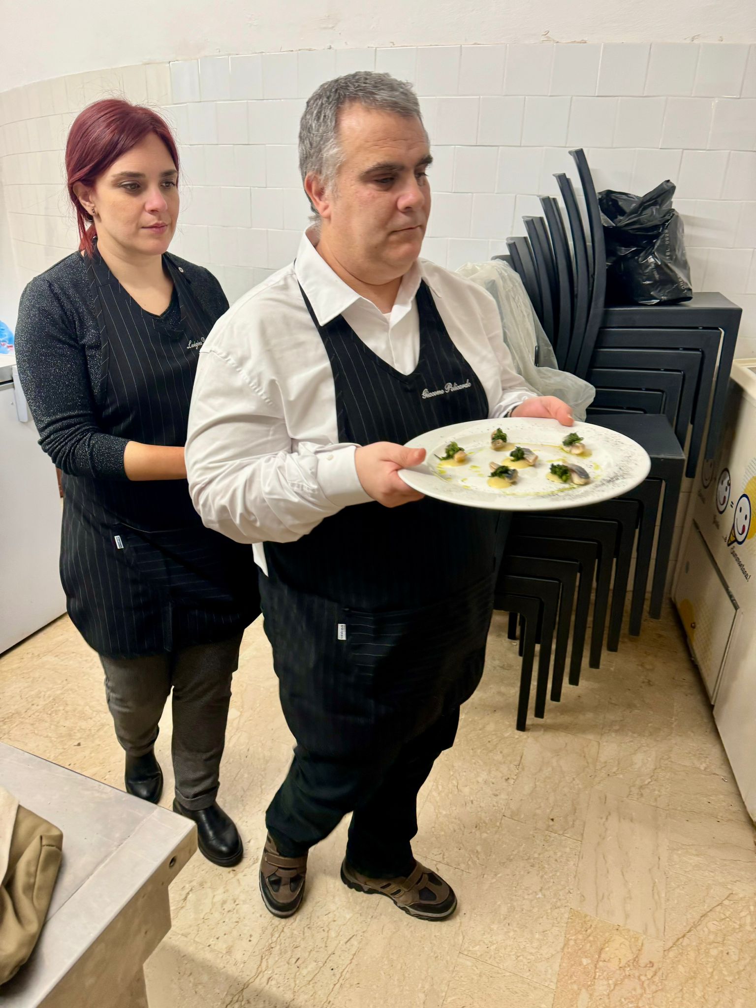 Si è tenuta ieri la seconda cena solidale, e così, Giacomino, Roberta, Luisa si sono cimentati nel servizio in sala; toni ha curato il servizio bar distribuendo il vino e Manuela ha affiancato chef bottaro in cucina e si è filettata nel farcire i baci panteschi direttamente in sala.