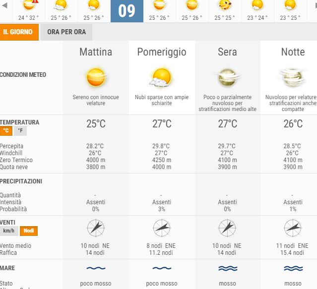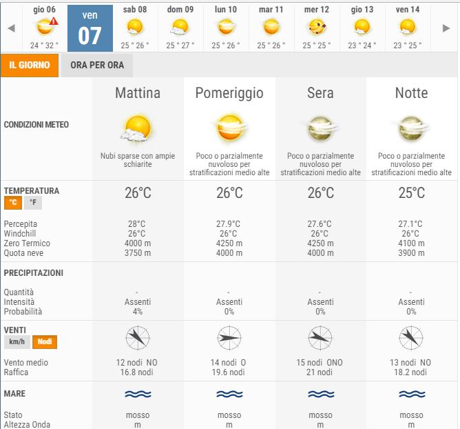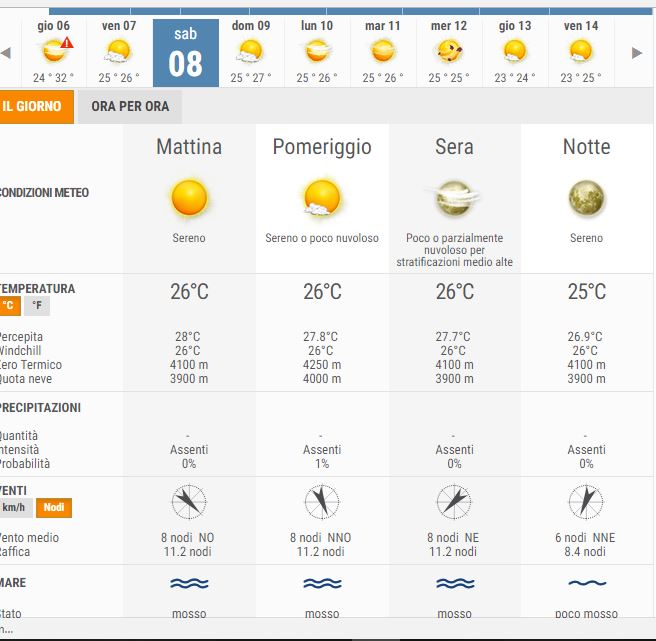 Le previsioni anche per questo fine settimana sono caratterizzate dal bel tempo. Sporadiche nubi veleranno il sole, ma senza preoccupanti precipitazioni. I venti di Nord-Ovest seguiranno un giro nella rosa dei venti per dare spazio a brezze di 16 nodi derivanti da Nord-Est. Le temperature rispetteranno le medie stagionali con minime intorno ai 25° e massime di 28°. Mari da poco mossi a mossi.