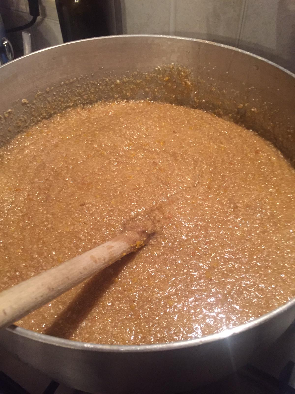 Mettere in una pentola tutti i liquidi e lo zucchero, quando il composto arriva a bollore aggiungere il miele è un po’ di aromi.