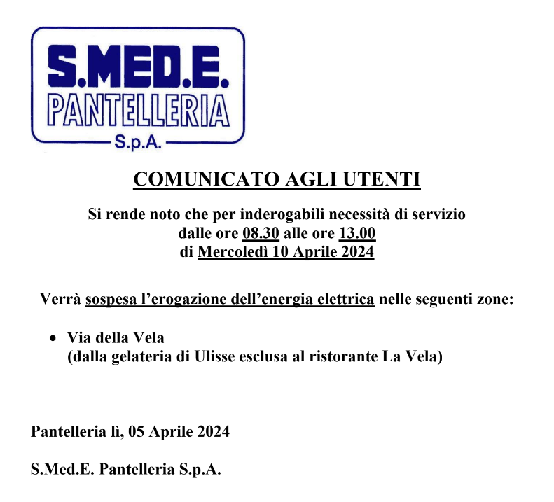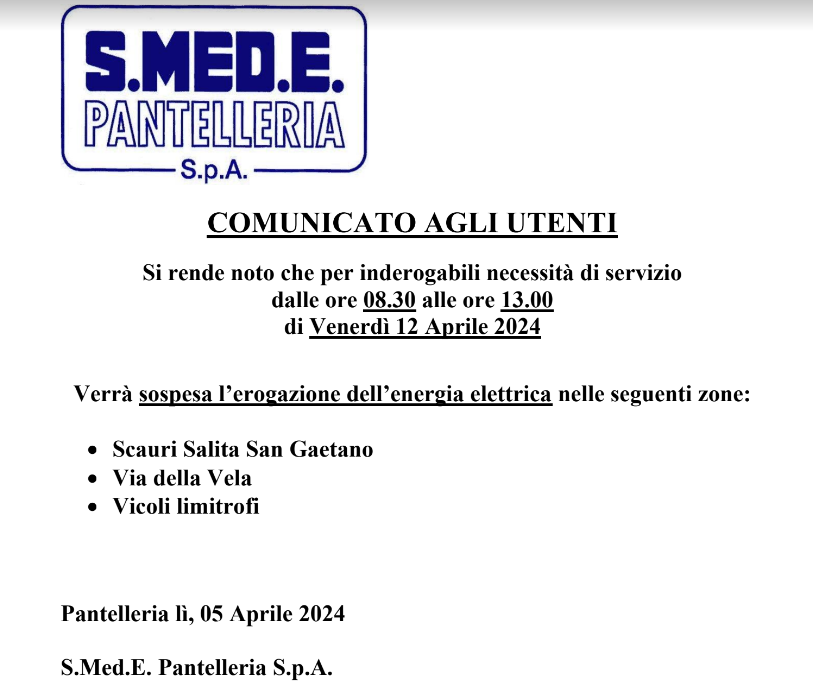 Pantelleria, interruzione energia elettrica per il 10 e 12 aprile