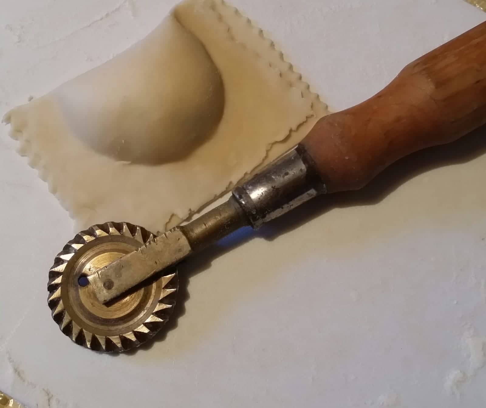 Sulle sfoglie, ora, ad intervalli di circa 5 cm. ponete il ripieno, o potete tagliare la pasta in quadri da 5 cm. circa, al centro dei quali porrete mezzo cucchiaio di ripieno e ripiegare formando dei triangolini. Premerete bene con le dita il bordo, tagliando con la rotella la pasta in eccesso formando una mezzaluna. Disponete i ravioli, a mano mano che realizzerete, su una tovaglia (in questo modo si asciugano un po’ senza attaccarsi ).