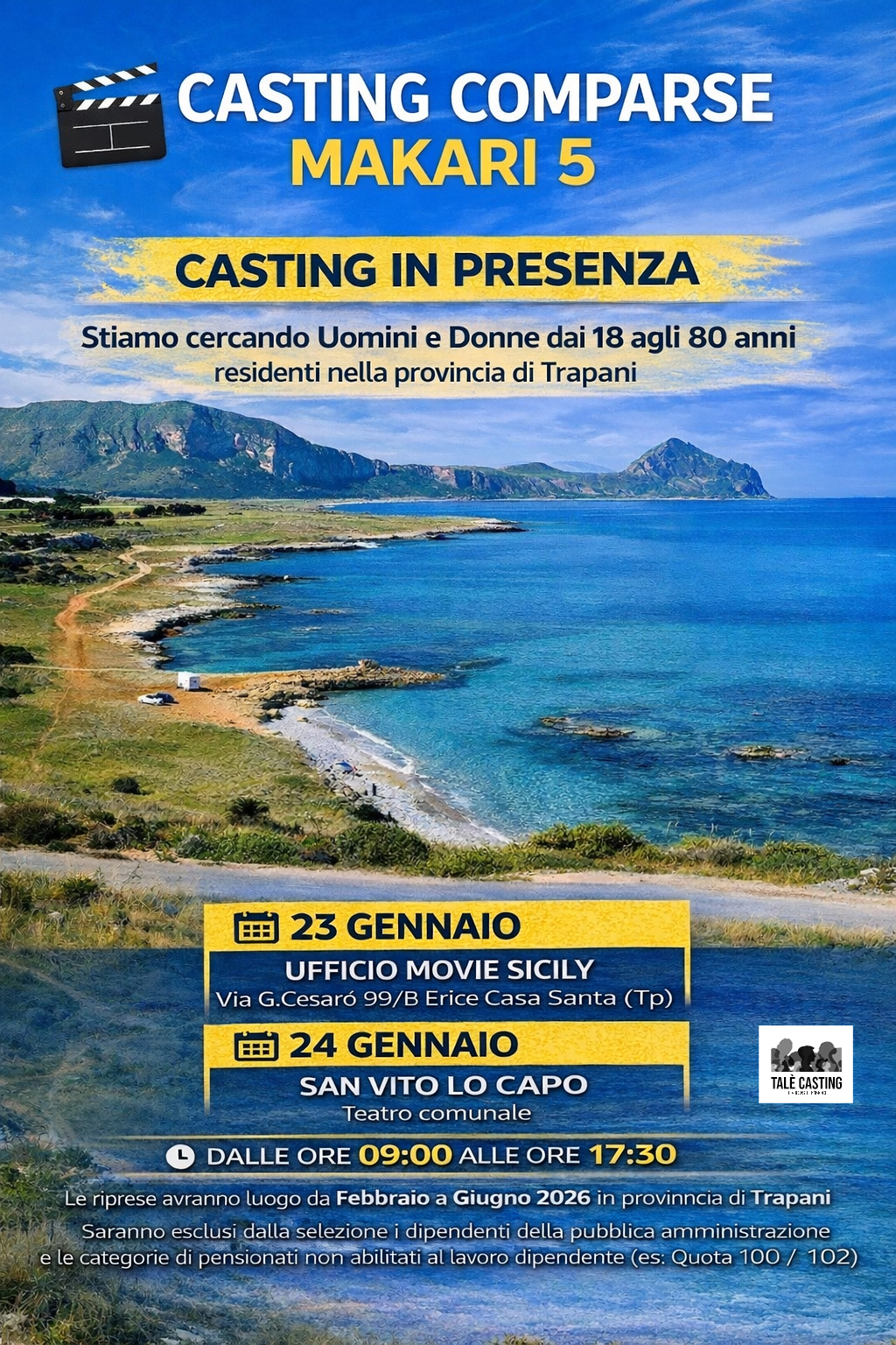 23 GENNAIO: Uffici Movie Sicily – Via Giuseppe Cesarò 99/B Erice Casa Santa (Tp)