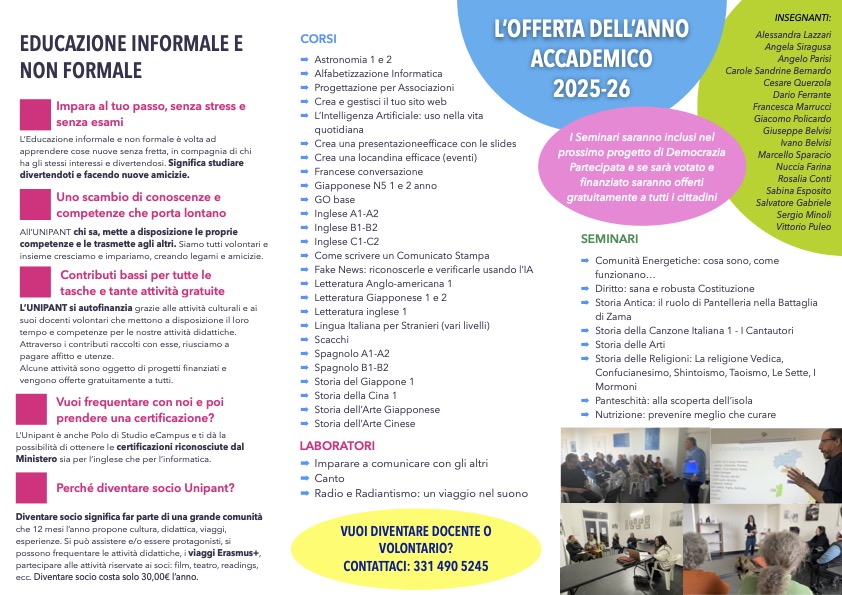 Altre attività si aggiungeranno a gennaio. L’Unipant metterà i Seminari e il Corso di Lingua Italiana per Stranieri nel progetto che presenterà al Bando di Democrazia Partecipata 2025 che, se votato e finanziato, permetterà di poter accedere a queste attività e ai Cineforum gratuitamente a tutti i cittadini.
