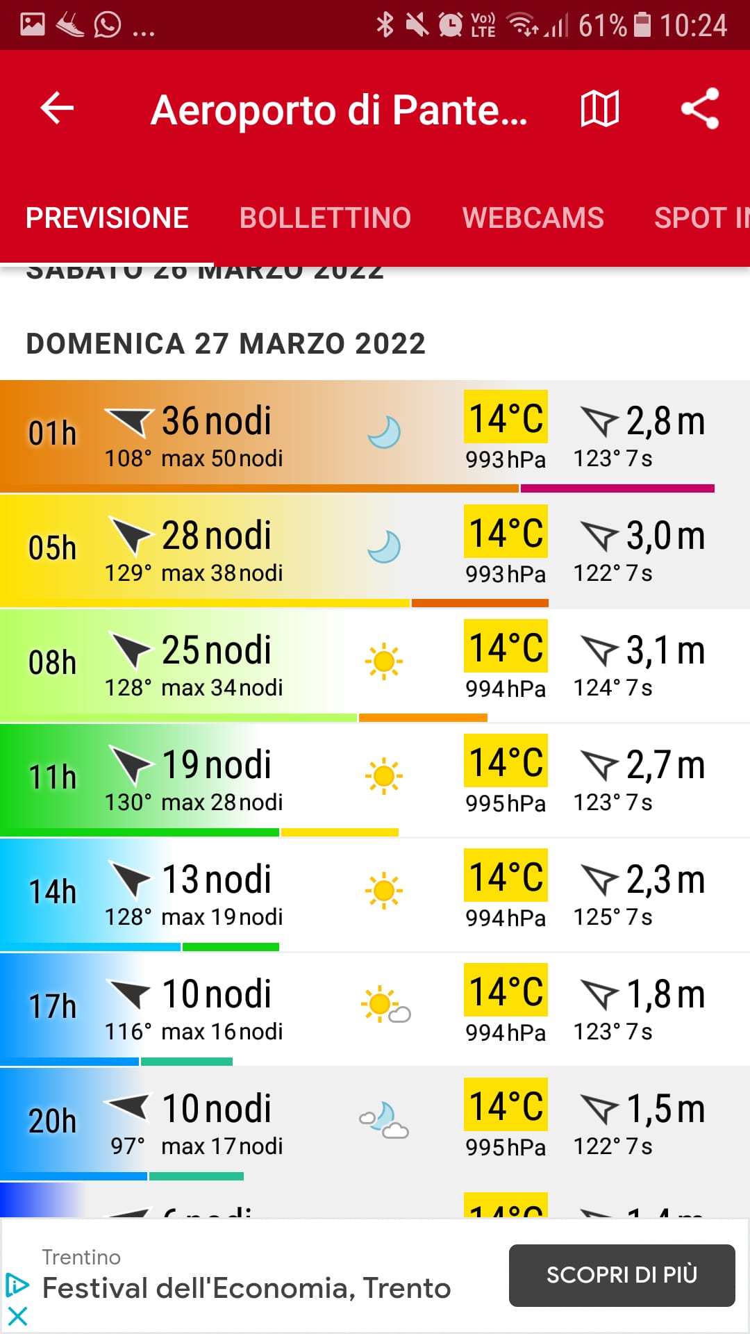 Windfinder prevede nel cambio di giorno fino a 36 nodi, con punte massime di 50, come si evince dagli schemi riportati.