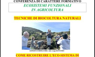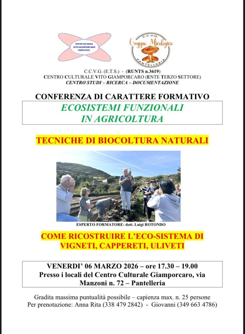 Venerdì 6 marzo, dalle ore 17.30, presso i locali del Centro Culturale Vito Giamporcaro di Via Manzoni 72 – Pantelleria, si terrà la conferenza di carattere formativo: “Ecosistemi funzionali in agricoltura – Tecniche di biocolutra naturali”.