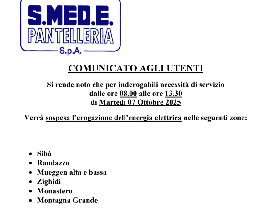 Per il giorno 7 ottobre2025, la Società SMEDE ha programmato un altro distacco di energia elettrica nelle contrade riportate nell’avviso pubblico che segue