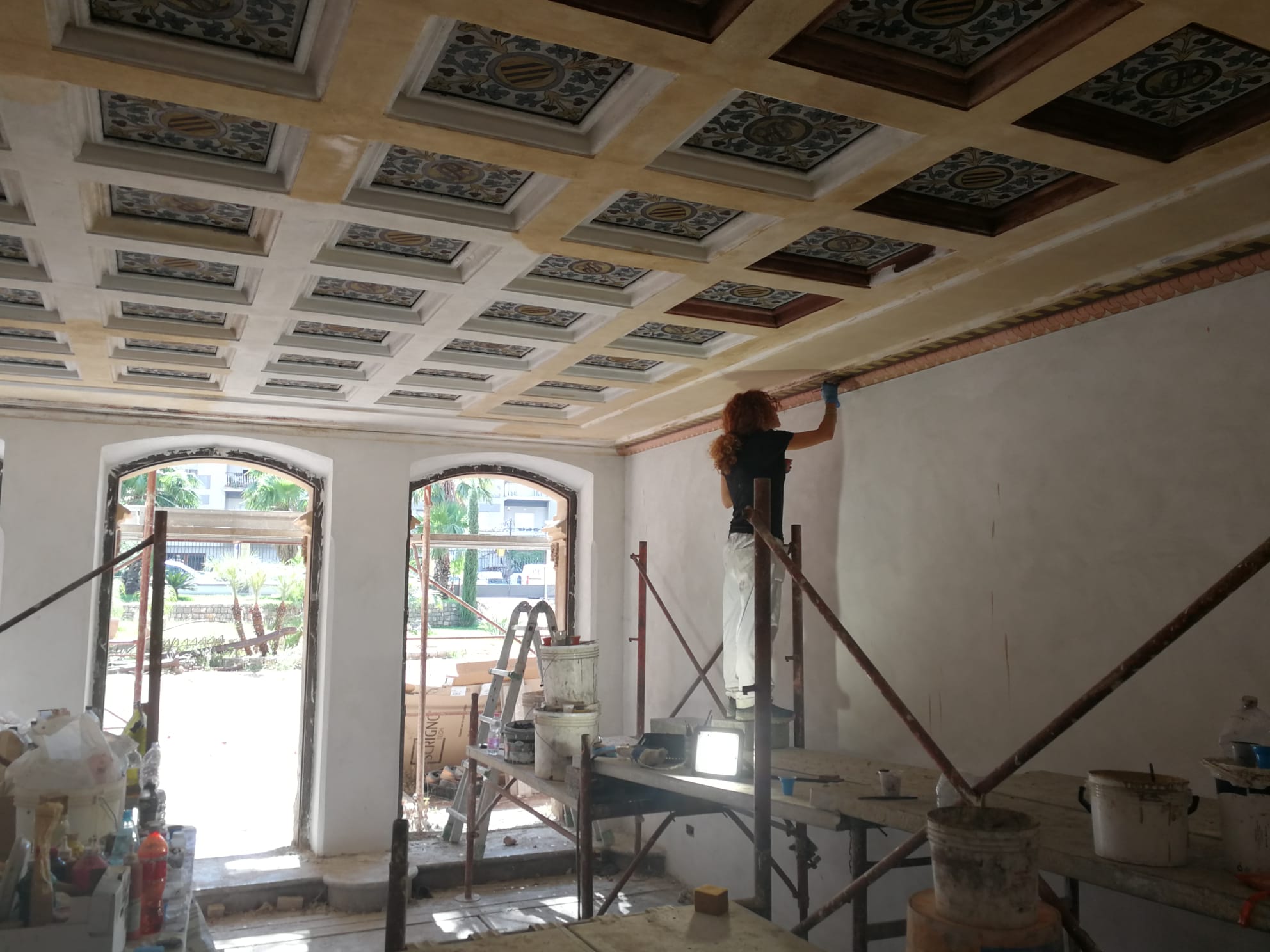 Gli interni Al piano terra le stanze più interessanti sono il salotto d’ingresso su via Serradifalco, nel quale si accedeva attraverso tre porte finestre con vetrate, con soffitto a cassettoni (in legno secondo dati storici, in intonaci cementizi nella realtà. Nel piano nobile quella che doveva essere la sala da pranzo, al di sopra del salottino d’ingresso, il soffitto era decorato con piccoli rosoni dorati su un fondo alternativamente rosso e azzurro ed attorno al soffitto a cassettoni corre una decorazione con coppie di angeli che sorreggono corone di alloro con al centro gli stemmi araldici di famiglie presenti in Sicilia. Adiacente alla sala da pranzo vi è una piccola stanza con un montacarichi collegato al piano terra, alla cucina a carbone, ricoperta ormai in parte da maioliche, dal quale, attraverso un passavivande, i camerieri servivano la tavola. Dalla sala da pranzo, scendendo due gradini, si accede ad un salone prospiciente la corte dove il principe Raniero aveva la sua biblioteca scientifica ed adiacente allo studio dove preparava e custodiva la collezione entomologica. L’ultimo piano doveva essere particolarmente interessante per la “sala del trono”, caratterizzata da porte in noce le cui cornici erano ornate da capitelli con foglie scolpite e da motivi tratti dal gotico “fiammeggiante”, inserite in esse vi erano ancora una volta gli stemmi degli Alliata. Nelle due stanze adiacenti doveva trovarsi molto probabilmente la ricca biblioteca letteraria degli Alliata con splendidi cassettoni lacunari e pavimenti in maiolica. Accanto alla sala del trono vi era la stanza da letto del principe Luigi e poi di Raniero, con doppie porte in noce finemente traforato e come nelle altre stanze il lambrì ed il tetto a cassettoni con figure zoomorfe. Oggi tutto è stato asportato.