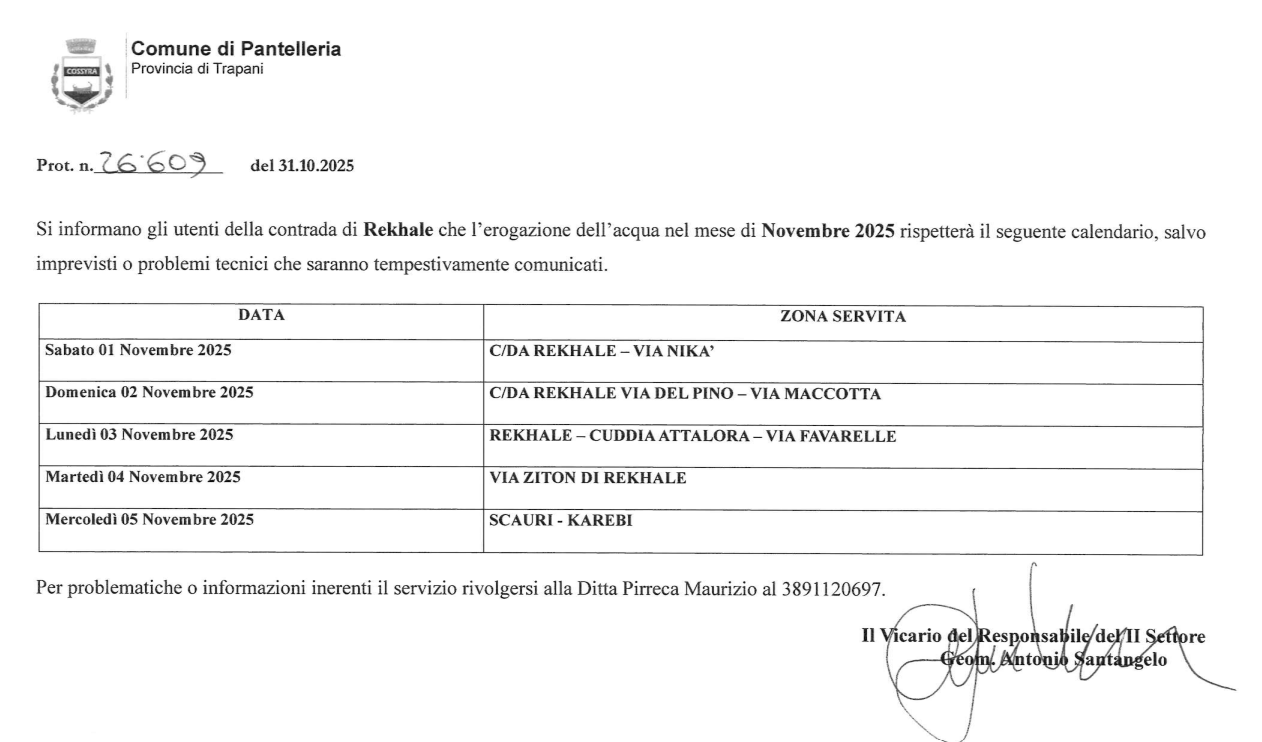 Pantelleria, calendario distribuzione acqua a Rekhale – si parte domani 1 novembre 2025
