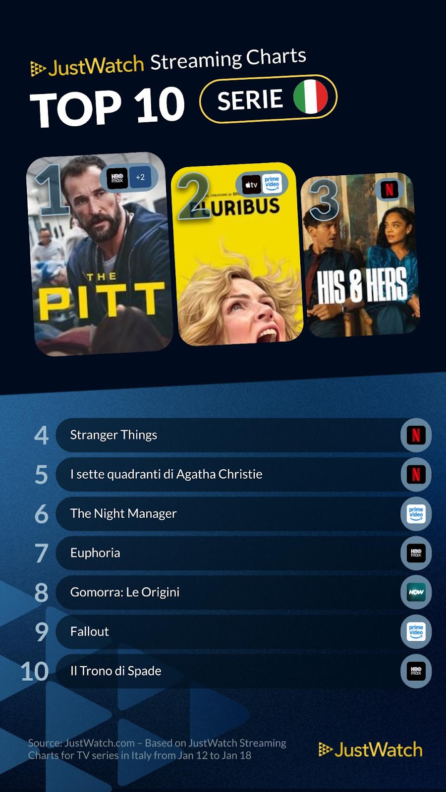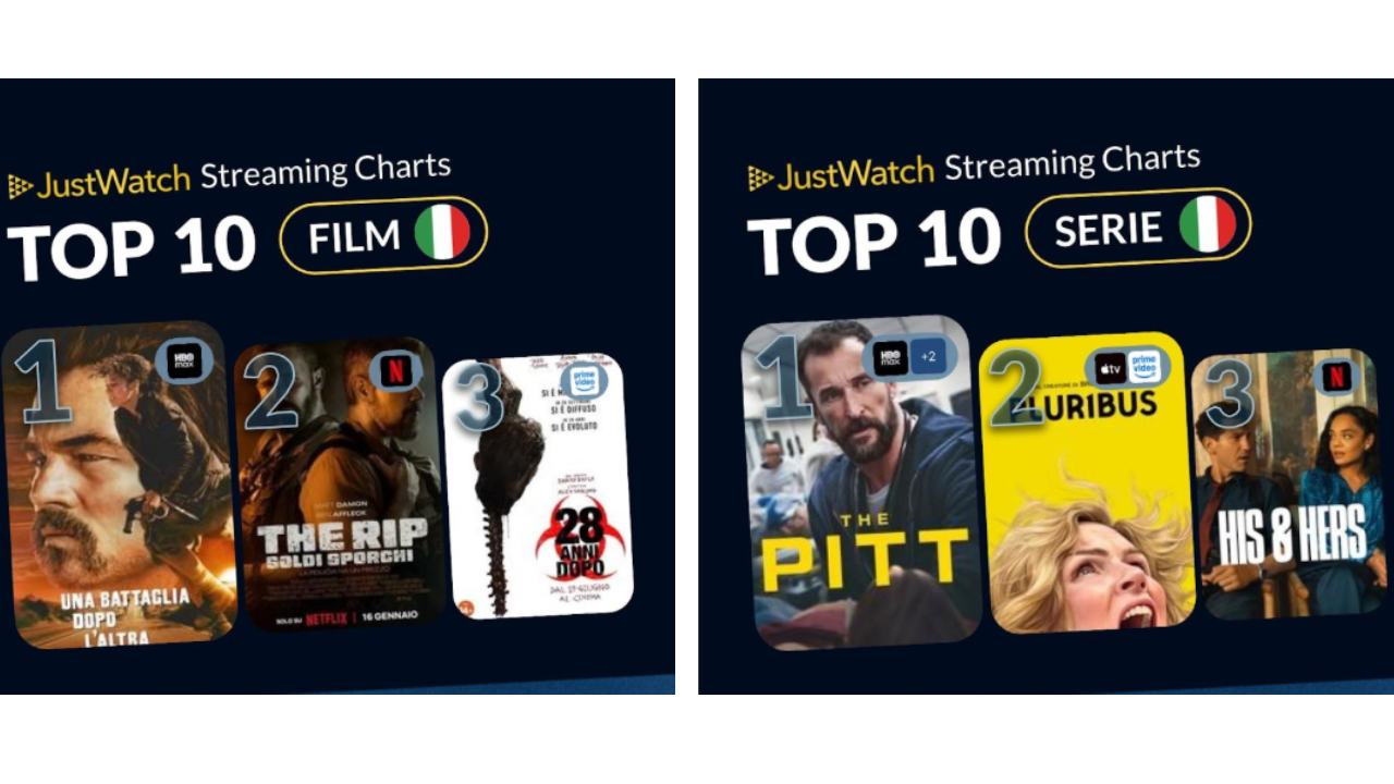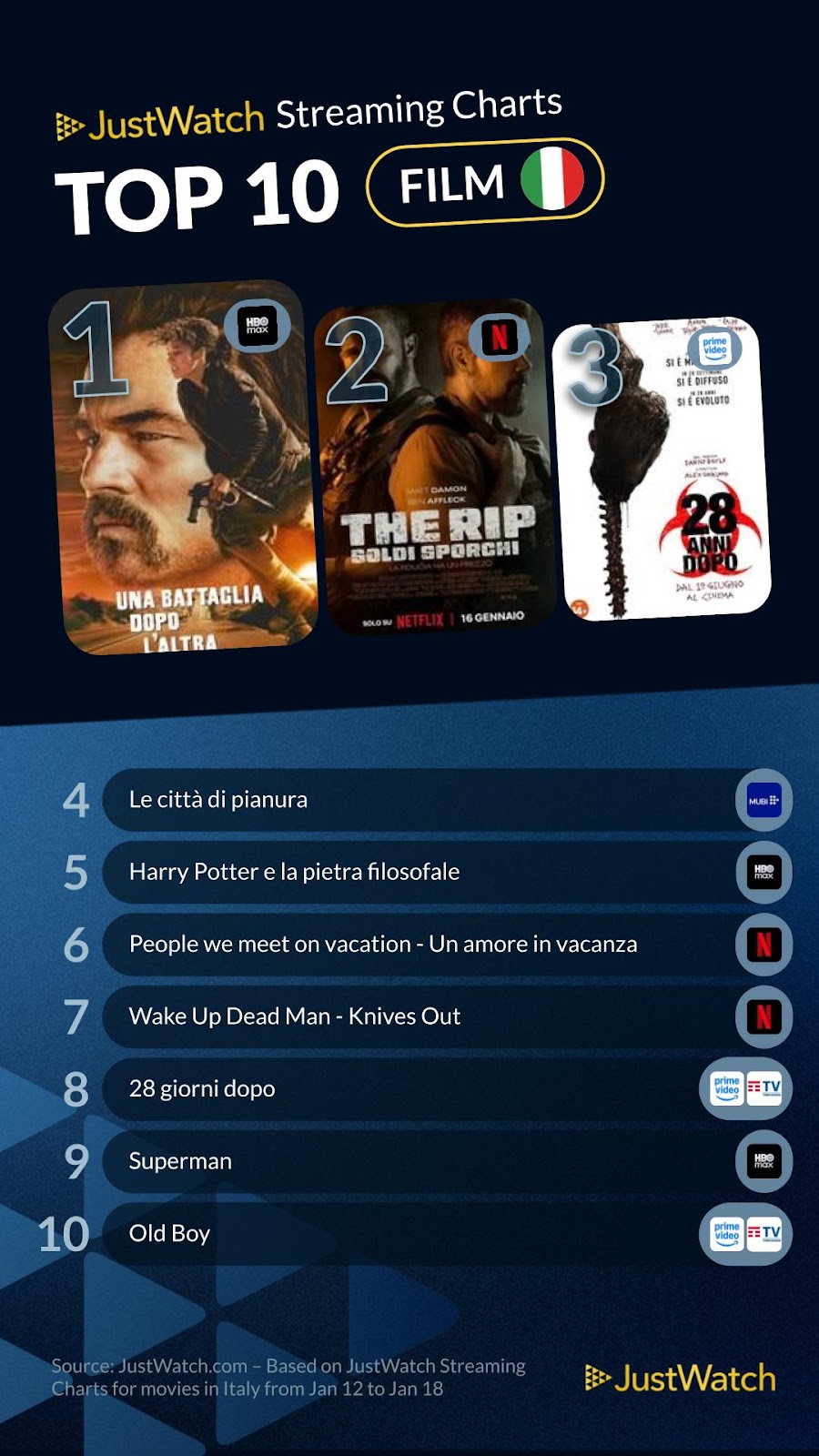 L’ultima classifica inerente a top film e serie TV più gettonate in Italia nell’ultima settimana: https://www.justwatch.com/it/streaming-charts