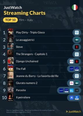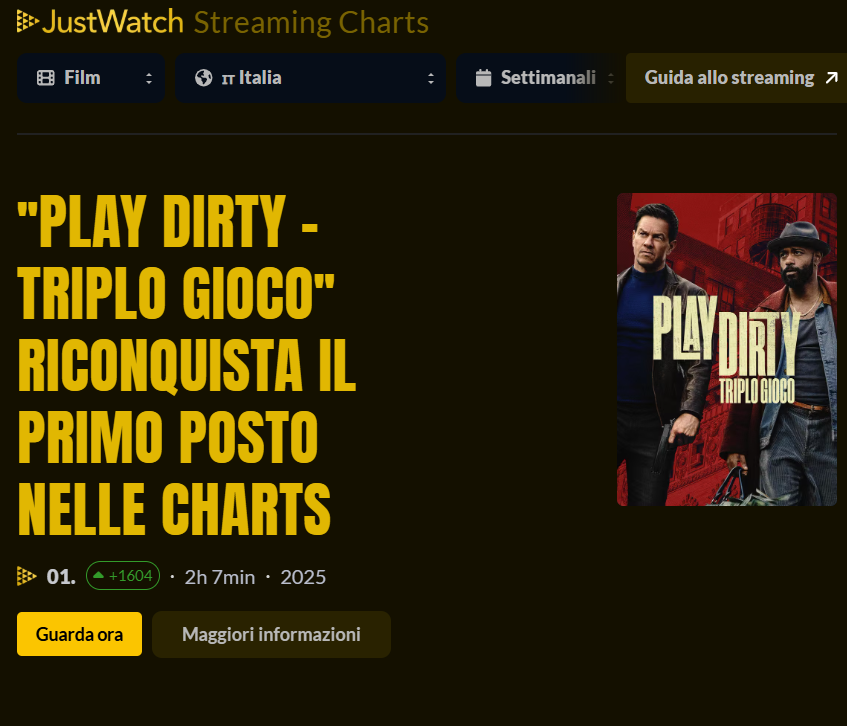 Per i film, questa settimana entra direttamente in vetta Play Dirty – Triplo Gioco. La pellicola segue Parker, ladro professionista, alle prese con il colpo della vita: una sfida mai affrontata prima, in cui lui e il suo team dovranno affrontare un dittatore sudamericano, la mafia di New York e l’uomo più ricco del mondo.