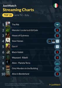 Per le serie TV, mantiene la vetta per la seconda settimana consecutiva The Pitt, che racconta l’impegnativo pronto soccorso del Trauma Medical Center di Pittsburgh. Lo staff ospedaliero si trova a fronteggiare ogni giorno un numero di pazienti superiore alla capienza del reparto, mentre i fondi rimangono insufficienti e le difficoltà si accumulano. Una serie intensa che mostra le sfide quotidiane di chi lavora in un ambiente dove ogni decisione può fare la differenza tra la vita e la morte.
