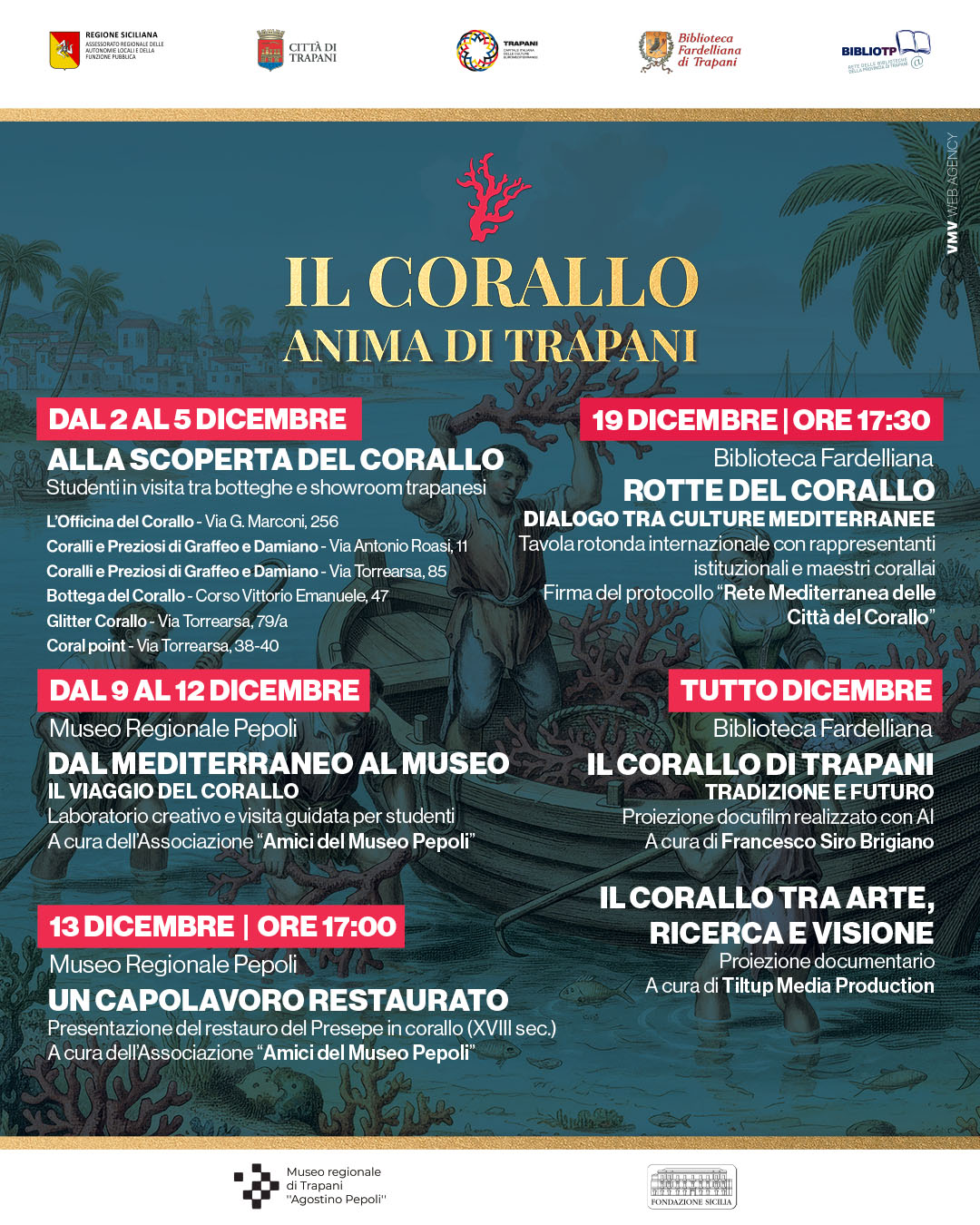 Il percorso prosegue dal 9 al 12 dicembre al Museo Regionale Pepoli con il laboratorio creativo “Dal Mediterraneo al Museo – Il viaggio del corallo”, curato dall’Associazione “Amici del Museo Pepoli”.