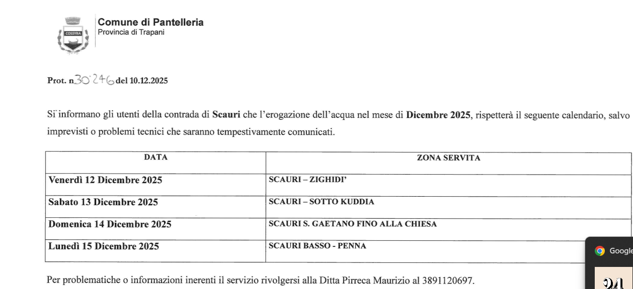Pantelleria, calendario distribuzione acqua a Scauri – dicembre 2025